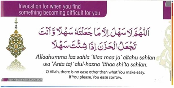 ibn hibban اللهُمَّ لا سَهْلَ إلا مَا جَعَلتَهُ سَهْلا وَ أنتَ تَجْعَلُ الحزْنَ إذا شِئْتَ سَهْلا allahumma la sahla illa maa ja'altahu .